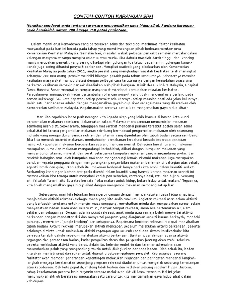 Huraikan pendapat anda tentang cara-cara mengamalkan gaya hidup sihat. KaranganNet Contoh Karangan Contoh Karangan. Contoh karangan spm 2022 bahasa melayu yang boleh anda rujuk dan buat latihan daripada sekarang bahagian A B termasuk pelajar form 4 tingkatan 5.